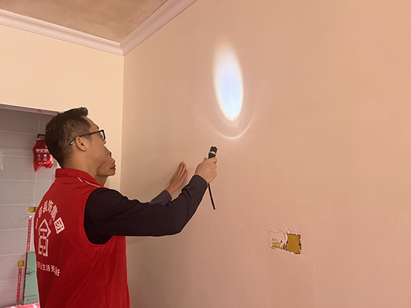 李总助使用专业的强光手电筒检查墙面的色差、气泡、掉皮、平整情况