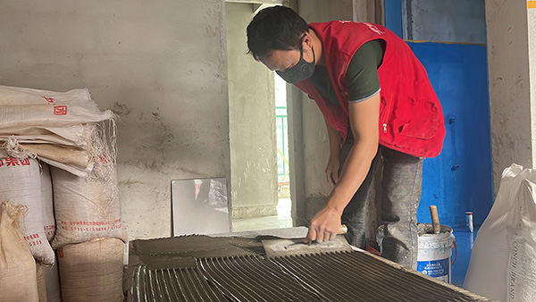 检查施工人员瓷砖水泥砂浆找平情况