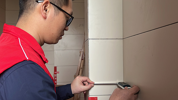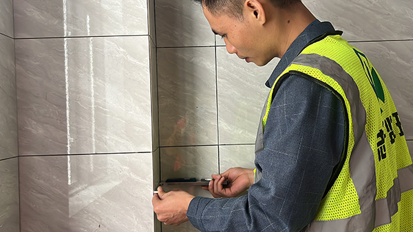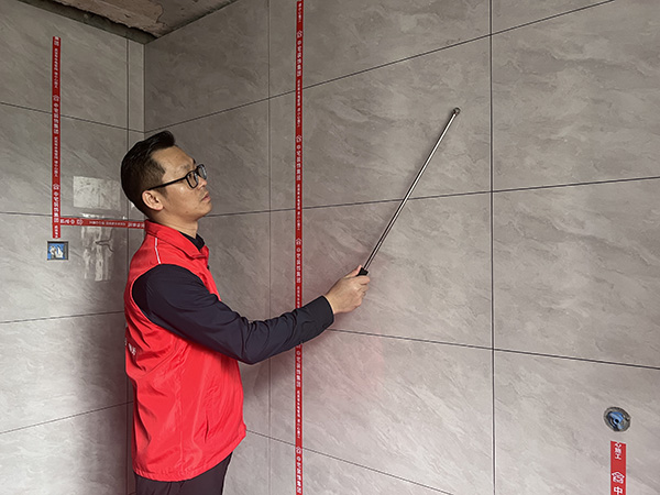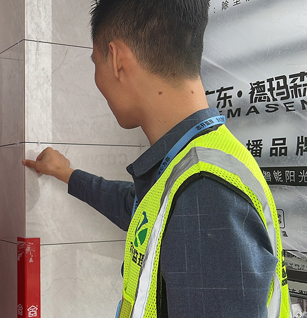 品质监督:第三方监理公司区域黄经理仔细检查上墙瓷砖的细节,瓷砖缝隙的粘合性和平整度,认真检查,确保施工的合规性