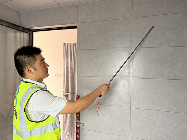第三方监理公司区域经理使用阴阳角尺来检测墙面的垂直度