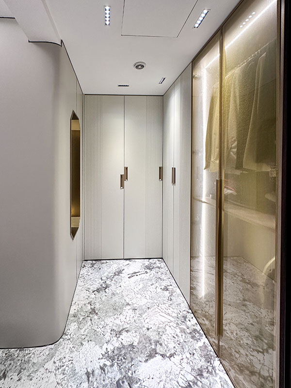 衣帽间是从主卧模块重组而来,脱离出来的空间做衣帽间,收纳一年四季衣,归纳首饰、帽子、丝巾等,挑选最适合你上班逛街穿的衣服。