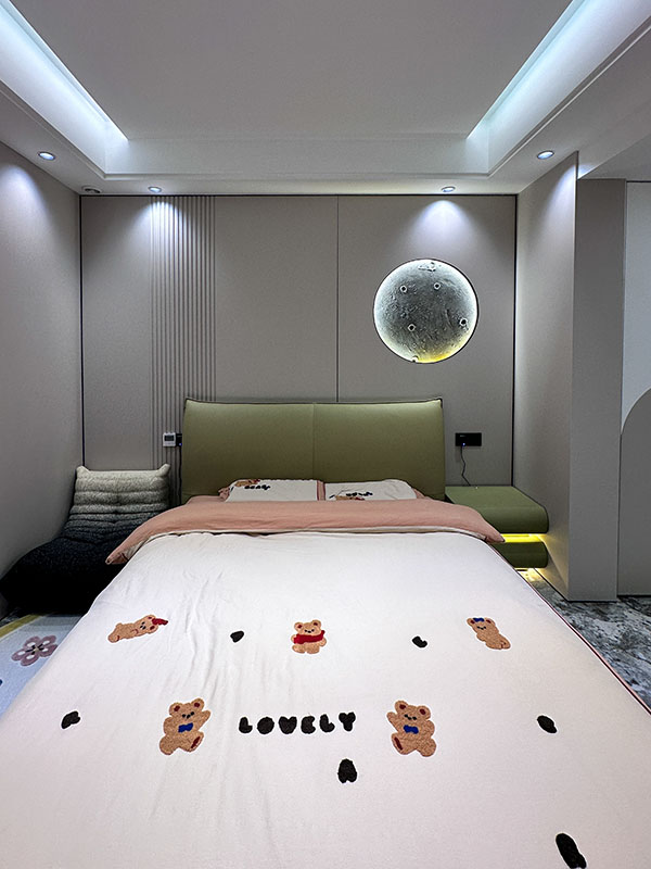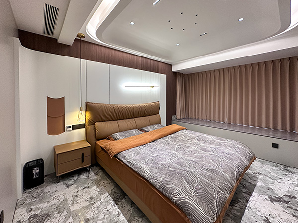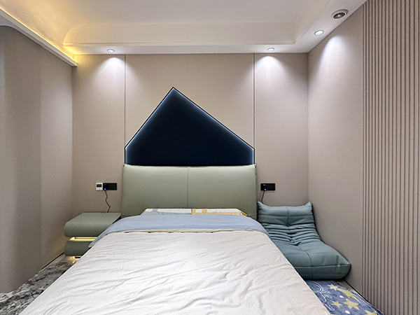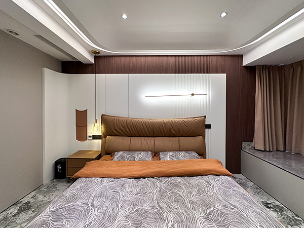 卧室墙体打掉后,重新规划,弧形处叠加护墙板,光的余晖落下,有种“曲径通幽处,禅房花木深”的意境。