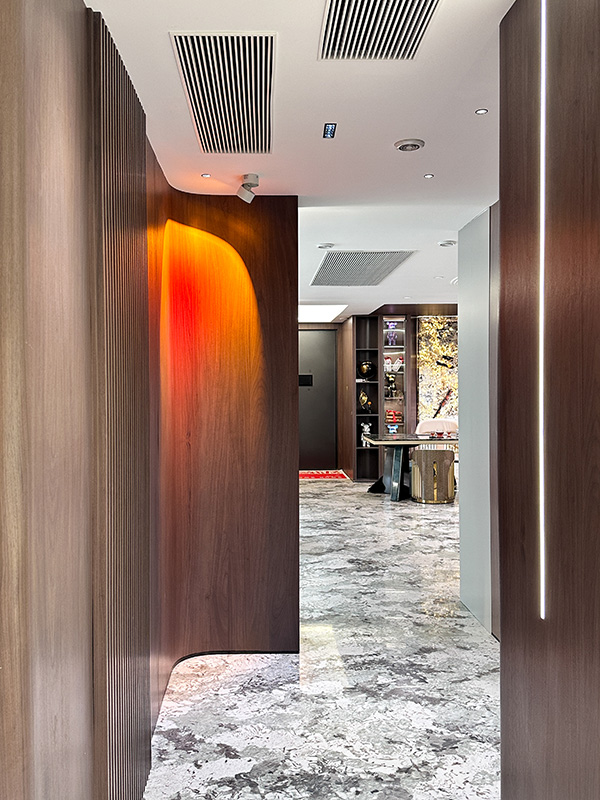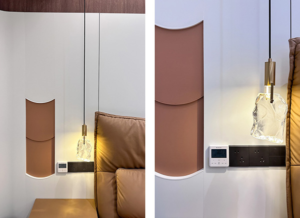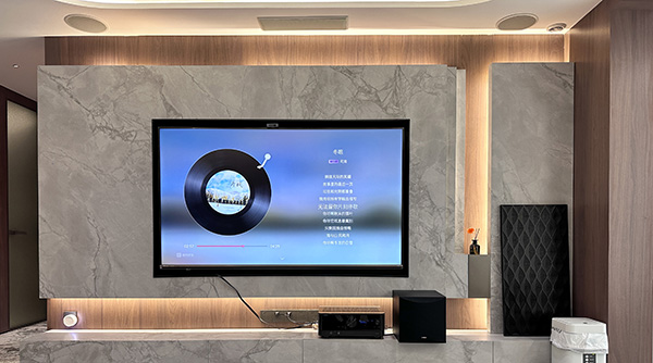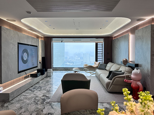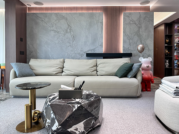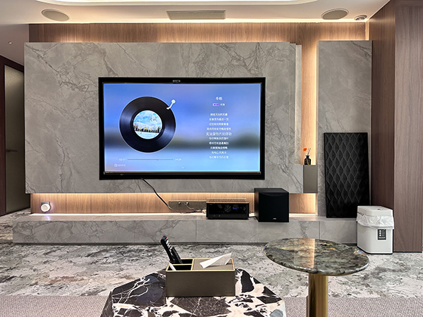 岩板背景墙嵌入智能电视,音乐响起,一室惬意。隐藏线性灯,轻轻点亮温馨浪漫氛围。