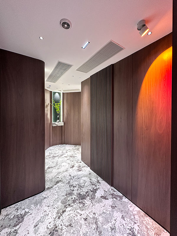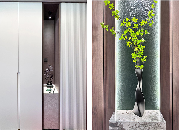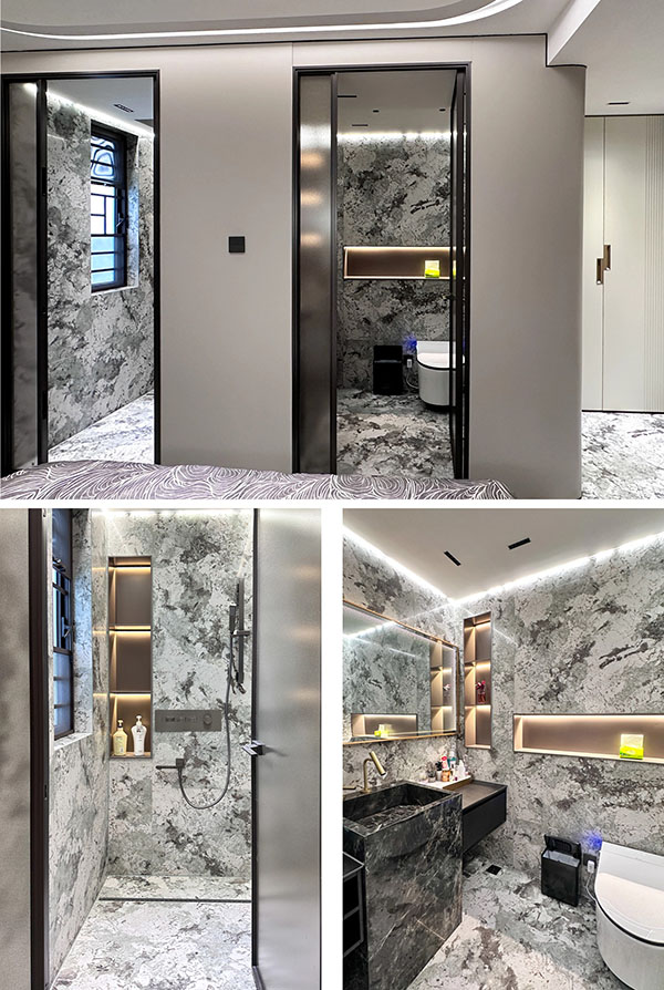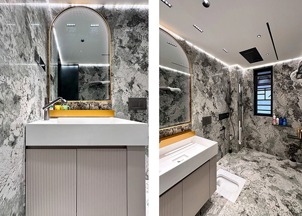 沐浴室与卧室墙面拆掉后,中间重新规划格局,步入沐浴室、洗漱卫生室两个空间,在虚实交织的光影空间弥漫低饱和色彩更加熠熠生辉。墙面上的壁龛分别放沐浴和洗漱用品,彰显设计无限魅力。