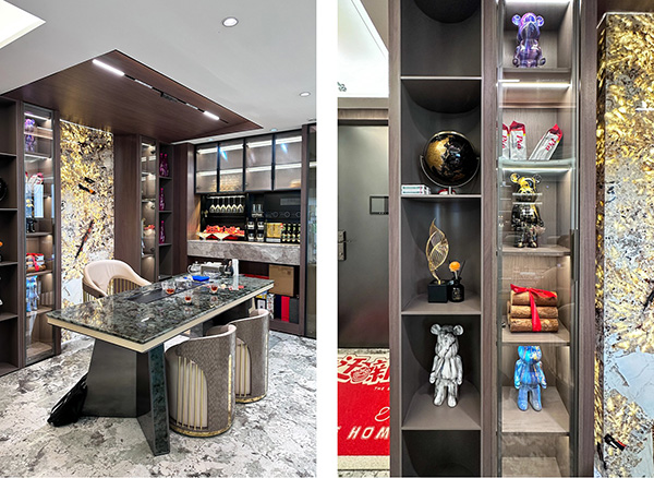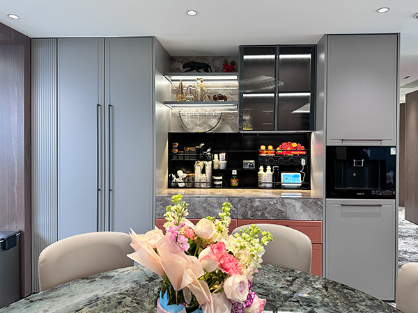 将原始厨房墙面打掉后改成茶室,两侧展示柜,灯光照耀下,装饰品无比闪耀。配置茶桌茶椅茶具,一壶清茶,三五好友围坐一起,品茶畅聊,舒适惬意。