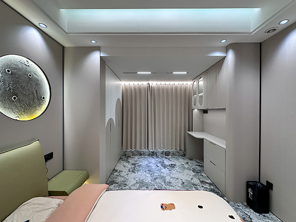 儿童房阳台打通后,用砖密封,私密性更好。护墙板上一个月球点缀,串联起现代美学。阳台一侧衣柜,从小培养良好的生活习惯。一侧书柜学习桌一体化设计,收纳书籍,看书学习,丰富学识,陶冶情操。