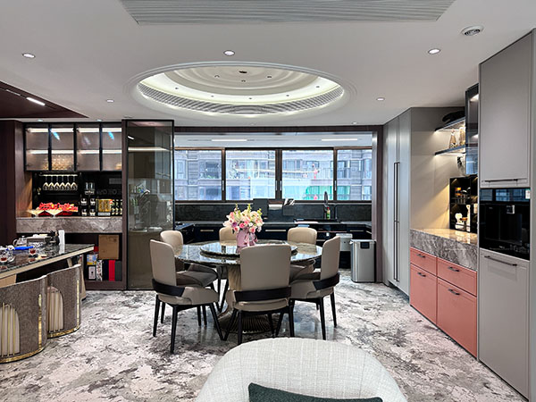 餐厅厨房功能区模块重组,打掉厨房后,空间合并成餐厅。圆弧形天花板,光向下一层层落下,逐层释放柔和的张力。餐边柜无敌收纳,嵌入式冰箱,保护食材鲜度。中间开放格储存日常用品和安装智能电源插座,便于小家电的使用。