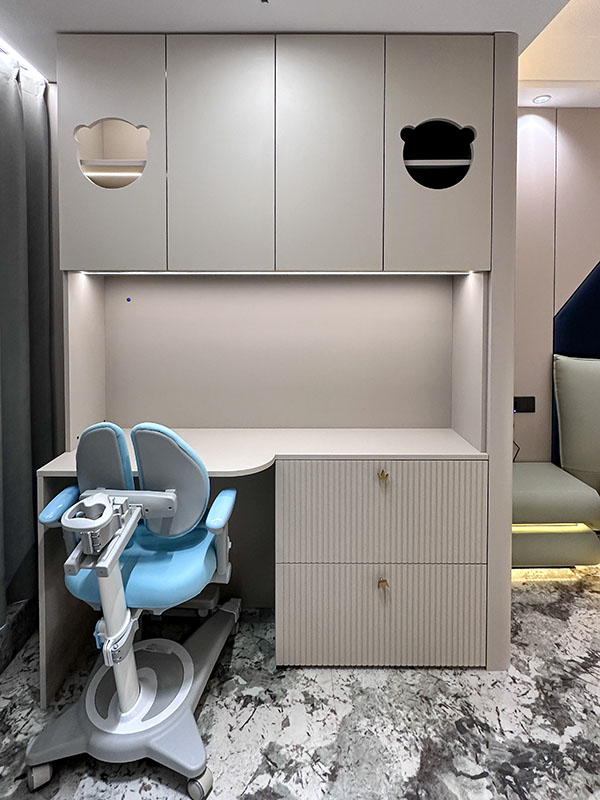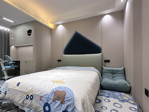 卧室与主卧拆改后重新组合,隔出两个独立的儿童房。墙面护墙板灰色低饱和基调铺展开,搭配柔软床品,毛毛虫沙发,卸下一天的疲惫。阳台打通密封后,一侧衣柜学习桌一体化设计,包容度高,收纳看书学习功能三效合一。