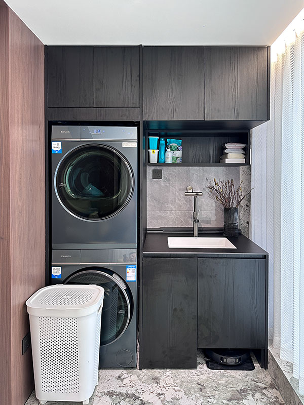 客厅阳台定制黑色洗衣柜,上面储物,下面集清洗收纳滚筒烘干洗衣机,解决了南方梅雨天气,衣服发霉发臭的情况,衣服清香无比。