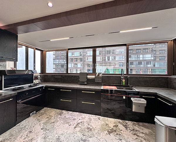 餐厅阳台打通后,化身烹饪厨室。“U”形高效厨房布局中,左侧烹饪区,中间洗菜备菜区,多人操作也不用担心,为烹饪塑造更有趣的互动场景。在黑色基底的烘托下,生活变得愈发丰富生动。