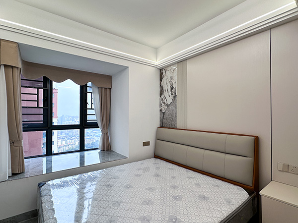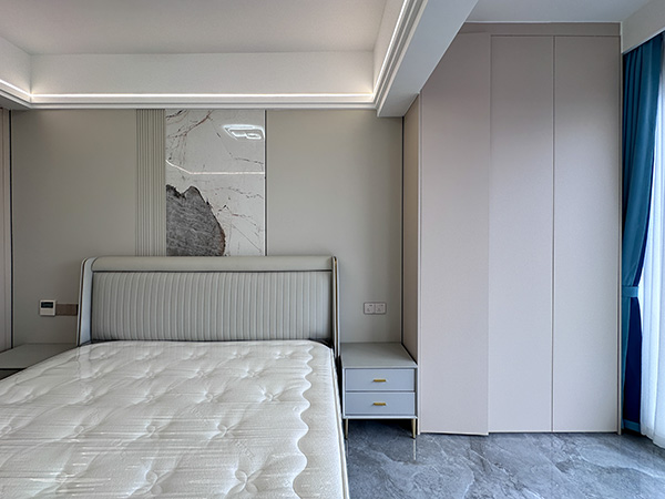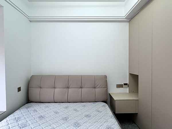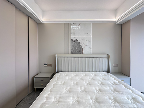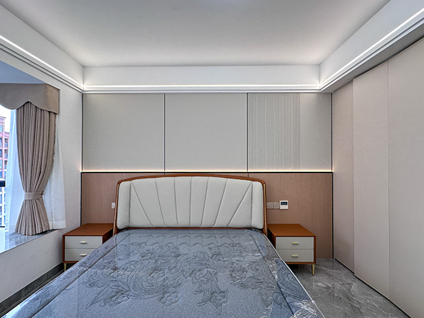 整个卧室的亮点之一,床头护墙板环绕线性灯,温暖轻柔的灯光,给卧室制造了温馨舒缓的氛围。