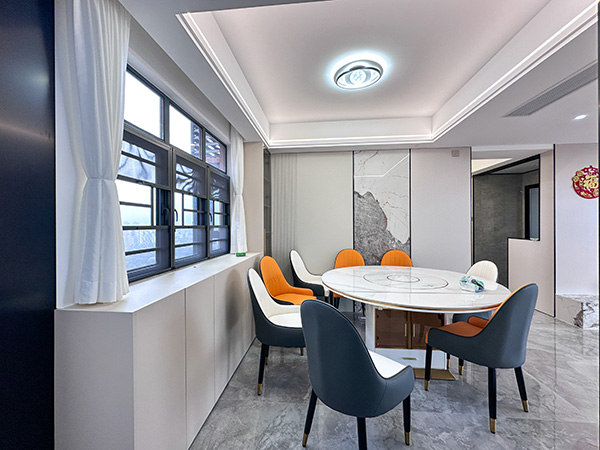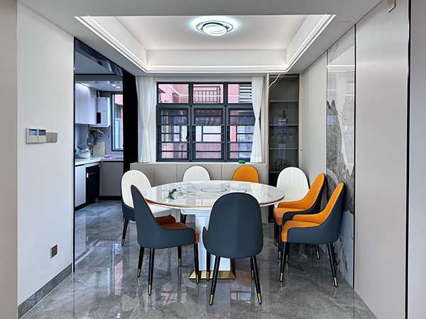 餐厅设计精巧,线条利落分明,客厅和餐厅的空间分割对比鲜明,有通透清爽的格调。干净的白墙、护墙板、吊顶、灯光多元素糅合,利用岩板圆形餐桌,搭配深色交汇的餐椅,可以很好地提升用餐的愉悦感。