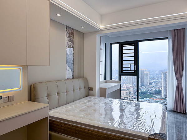 客卧通顶衣柜至天花板,垂直空间巧利用,收纳衣物被褥绰绰有余。延伸多功能书桌,学习办公阅读皆相宜,空间利用更精细化。