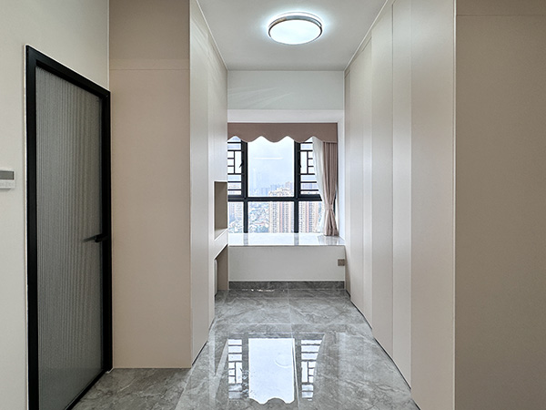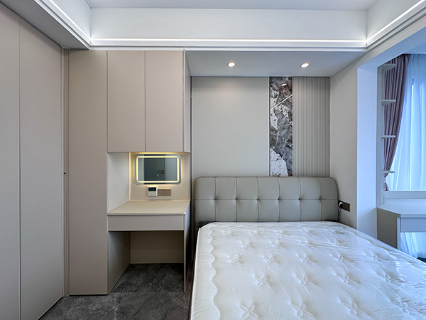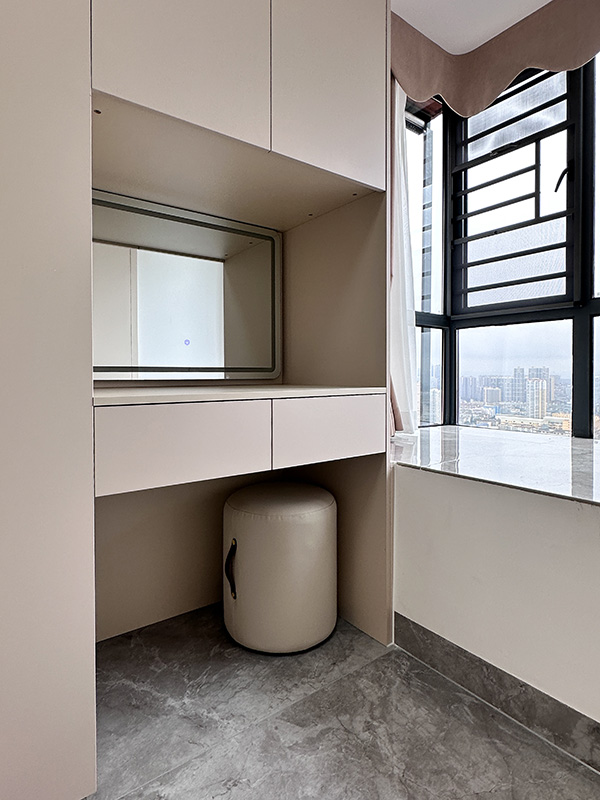次卧2过道巧变衣帽间,定制衣柜贴合空间,整洁有序也省空间,搭配一侧化妆台精致配置。