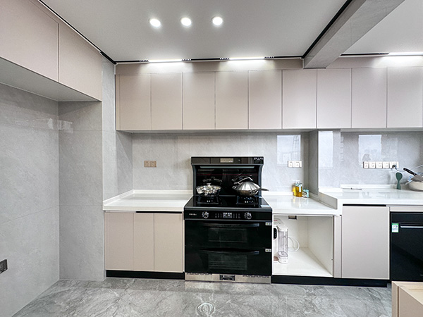 厨房是美食的摇篮。吊柜地柜巧收纳,把食材佐料厨具等这些井然有序地规整收纳。一侧预留冰箱位,方便后期放置冰箱。