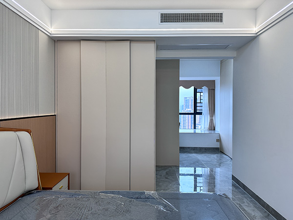 次卧1推拉门到顶衣柜,内部根据居住者的收纳需求进行细致划分,包括挂衣区、叠衣区、抽屉储物区等,方便居住者分类存放衣物。护墙板护而墙有力保护墙面,防止不小心碰撞造成的伤害。