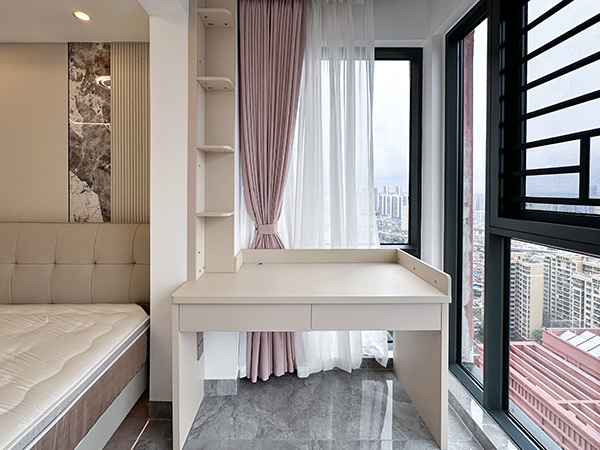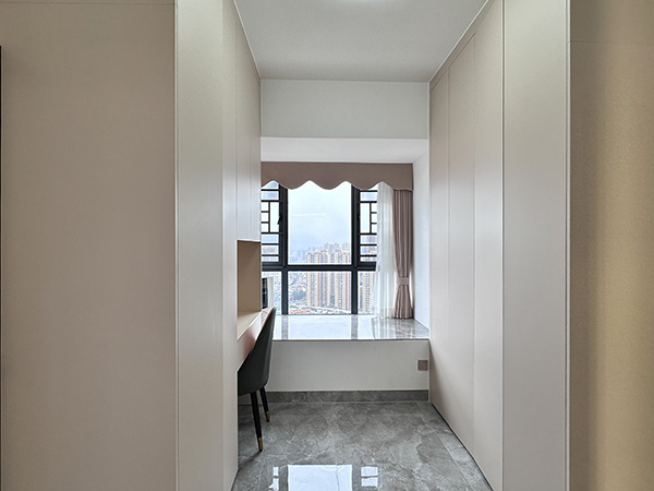 次卧1巧改飘窗,阳台空间焕然一新。一侧定制柜收纳有序,另一侧书桌静谧雅致,工作或阅读皆相宜,舒适生活尽在此。