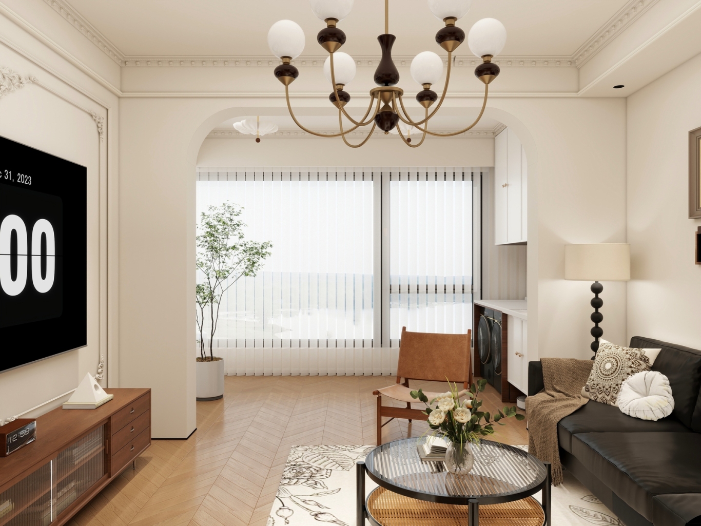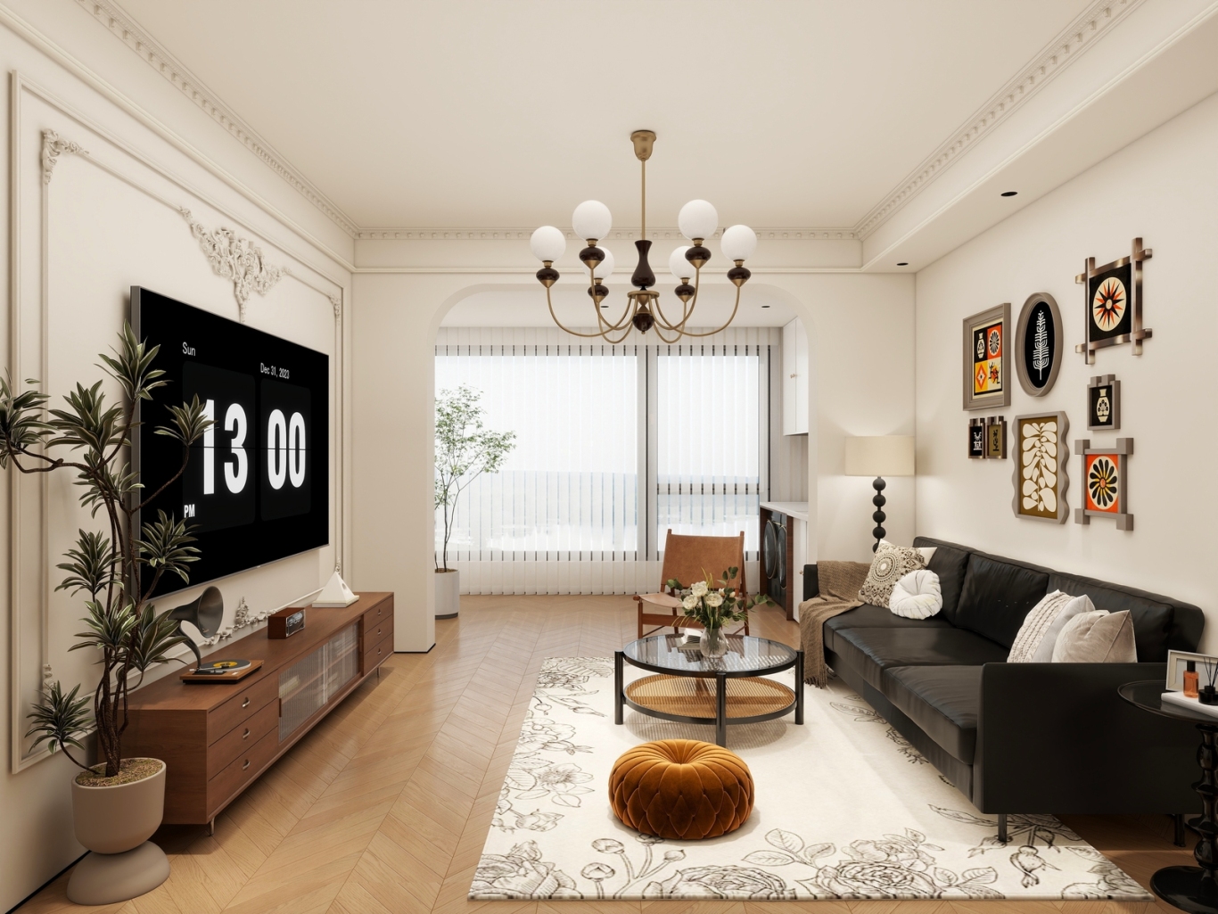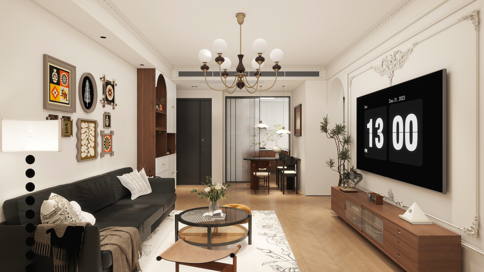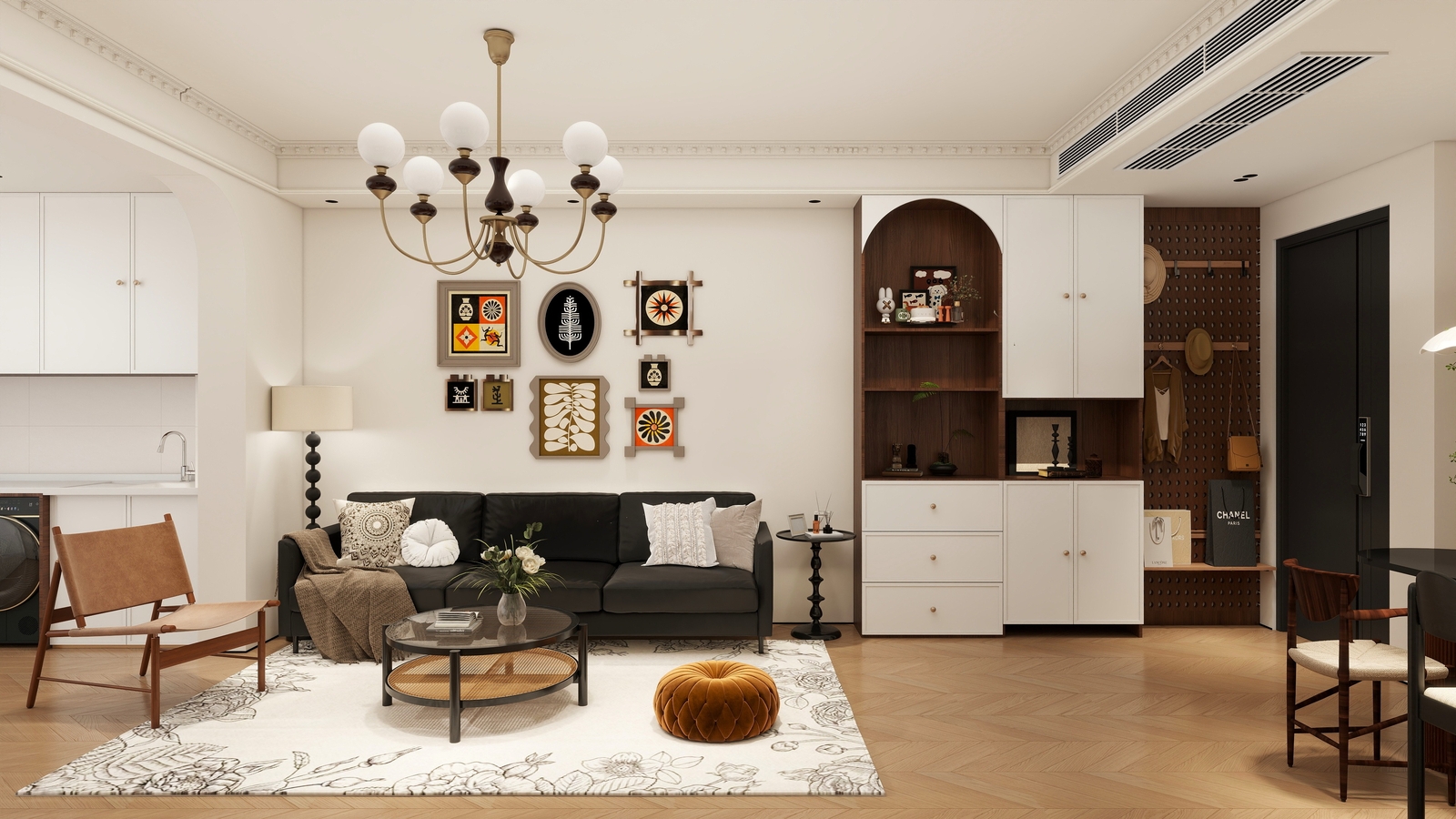 天花板的奶白玻璃球吊灯,黄铜灯架搭配深色细节,自带复古滤镜,同时低饱和度的灯光不会压低层高。地面通铺人字拼木地板,温润的木色顺着拼接纹理延伸,从视觉上拉长了空间,完全没有小户型的逼仄感。
