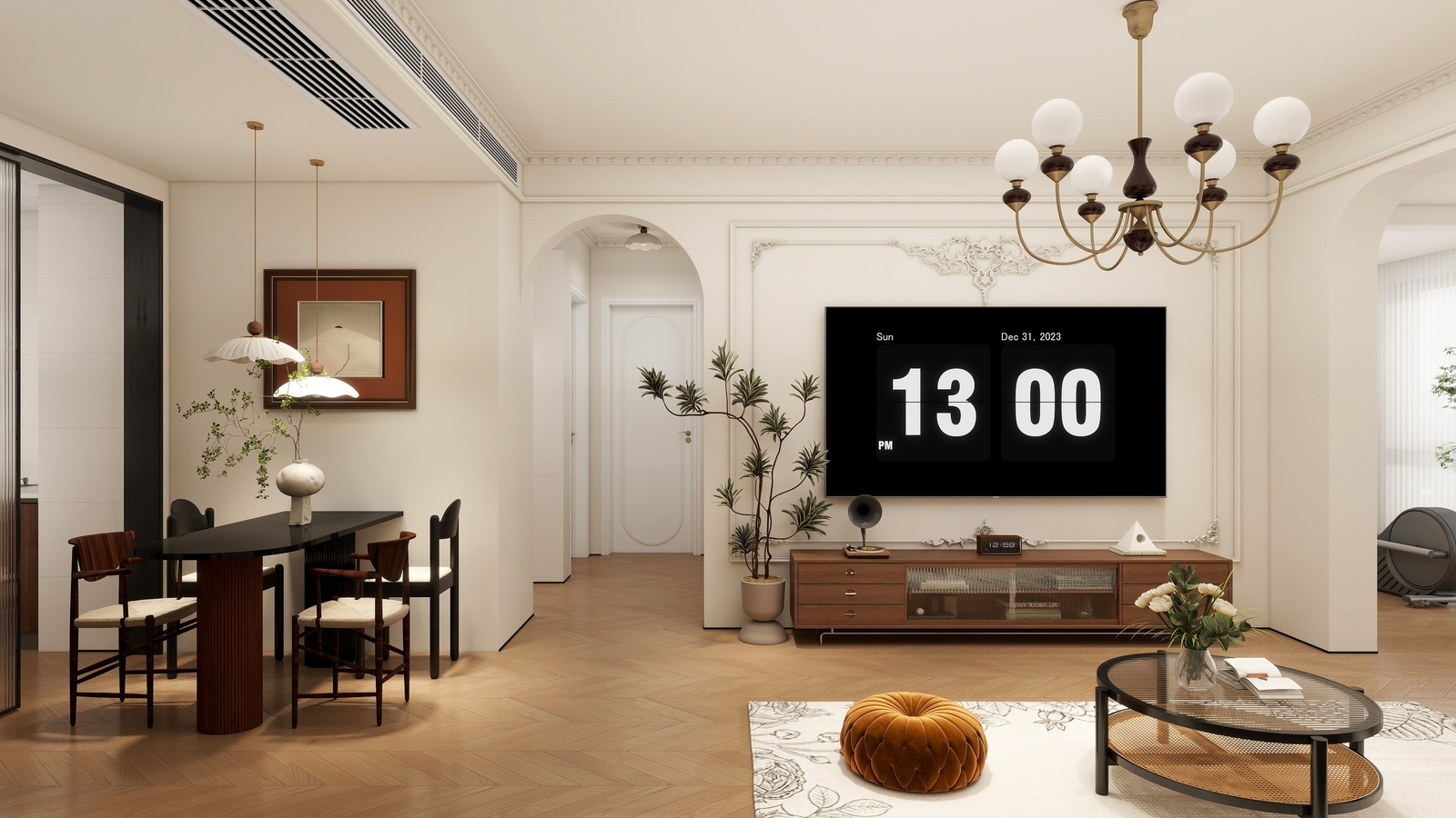 小户型最怕压抑,这套设计直接用法式的松弛线条解决了这个问题。暖白色的墙面搭配简约石膏雕花线,没有复杂造型,却自带精致感,让大白墙瞬间有了层次,也让客餐厅的视觉动线直接延伸到阳台,瞬间拉宽空间感。