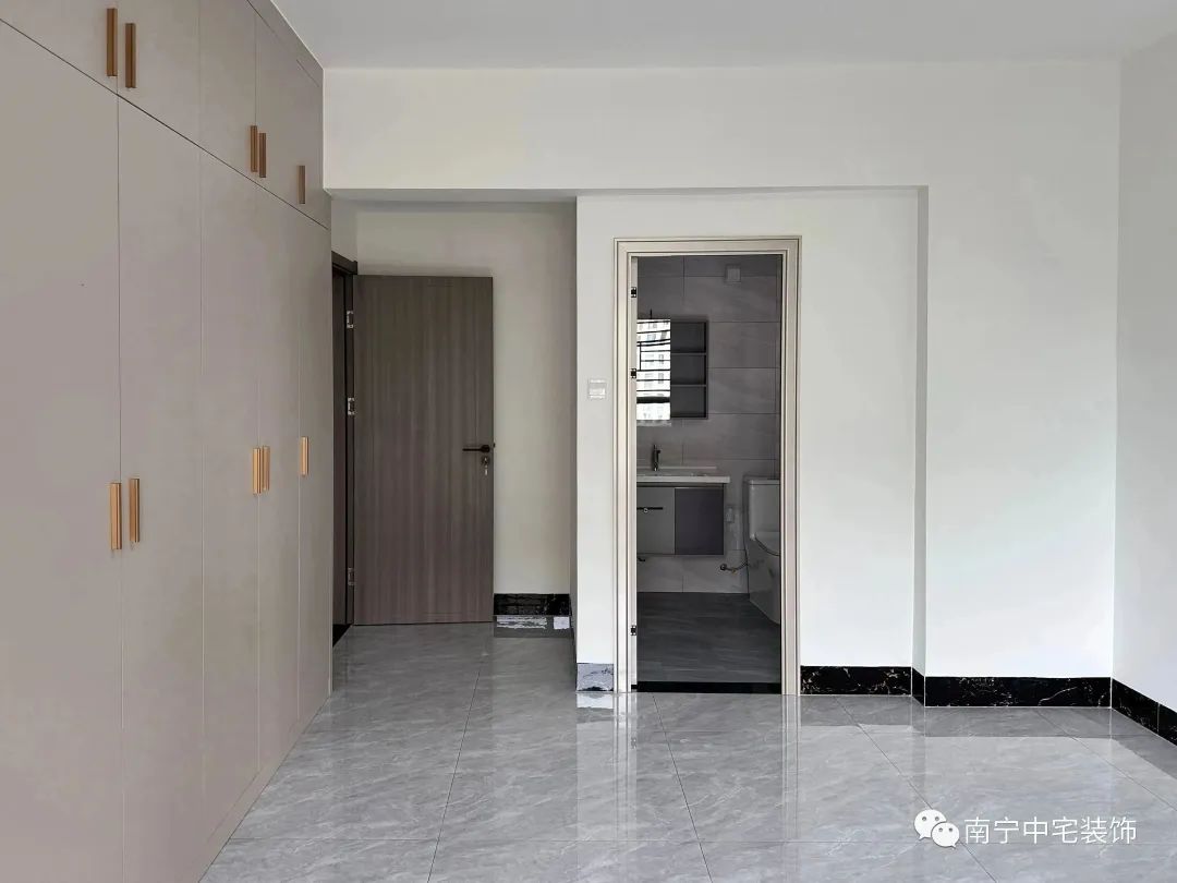 主卧满墙内嵌入式的衣柜,成为您的收纳宝典,让其光亮如新,定制衣柜以浅色系列为主,就如同清风拂过的轻柔。
