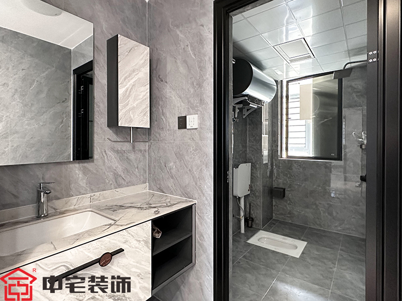 ▶洗手间采用干湿分离的设计,厕所根据中国人的习惯还是沿用老式的蹲厕,洗漱台灰白相间的瓷砖台面,就如同一幅流动的山水画,美化家居,前面安装的一面镜子,它成为我们的美容大师,让我们每天都能精神抖擞的面貌迎接新生活。