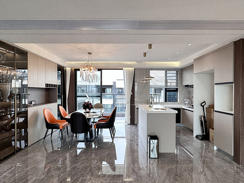 厨房中间做了一个倒台,是洗菜和洗水果的地方,洗完后就直接在倒台台面进行处理,很方便,倒台汇成的清浅光影,马上变成厨房动态背景,厨房的色调与餐厅的餐桌交相呼应,营造轻盈舒适的节奏与律动。