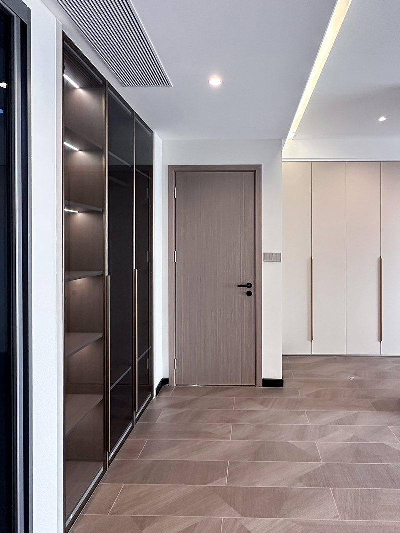 主卧光影、肌理、质感、温度的叠加,墙面格栅背景墙软化空间,让空间变得更加细腻与柔软,提高品质,让空间更有深度与立体感,吸音和降噪的功能,减少噪音对睡眠的影响,让空间更加舒适安静。入门既是衣帽间,玻璃衣帽间的设计,让衣物更好的展示,换装更方便。