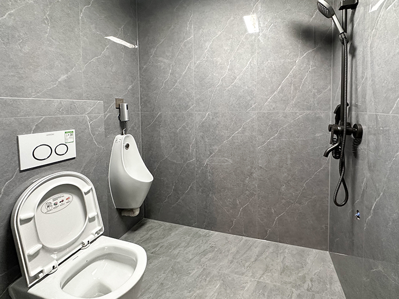 洗手间与主卫的装修风格一致,考虑到男女有别,设计了男女便池,互不影响,灰色的瓷砖铺满整个空间,很好的综合空间的色调,让空间由冷色调过渡成暖色调,温暖不失高雅。
