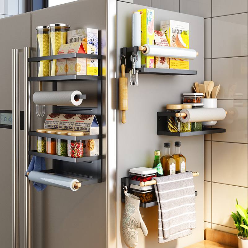 磁吸式收纳架可以吸在冰箱或者热水器上面,用来收纳小物品。例如厨房纸、保鲜膜、小水果刀等物品,都可以吸在冰箱上。