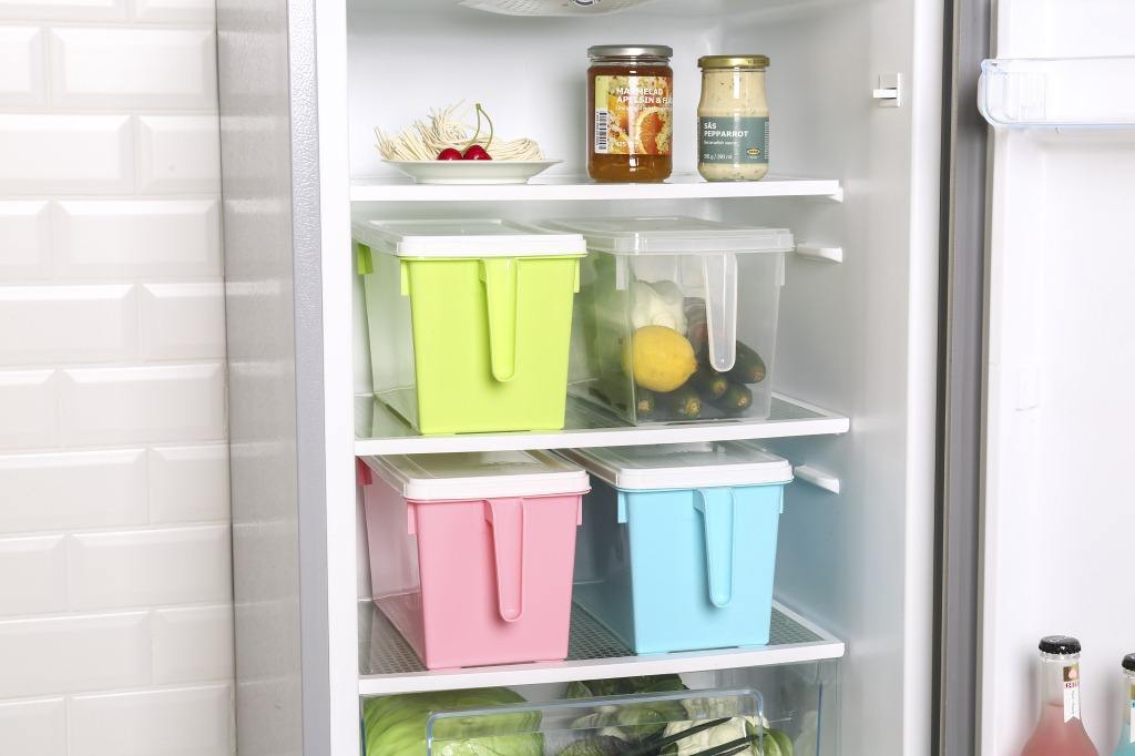 冰箱门架收纳盒放置一些调料、酱菜瓶等物品。