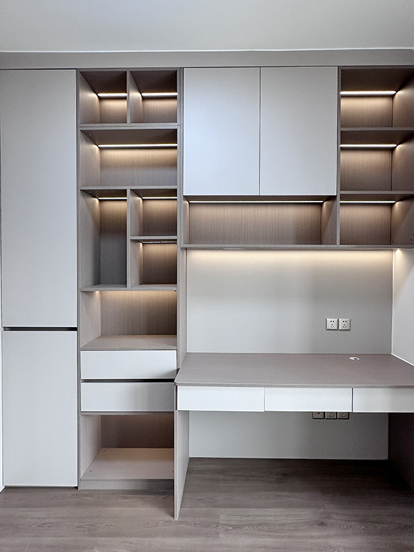 多功能书房逐渐变成都市人们的刚需。独立书房开放格空间布置的线性灯,视觉上的延伸性,增强空间的流动质感,赋予空间浪漫的氛围感。一书一灯一人,不同氛围的意境感。