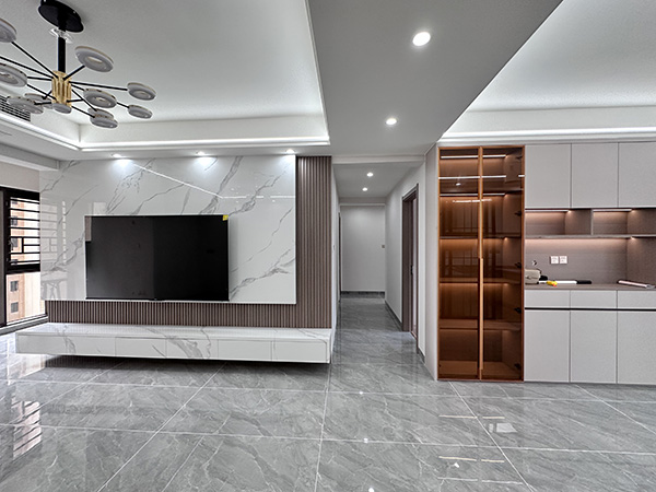 客厅空间整体以灰白色调为基准,重视低调温润的线条传达,通铺60cm*120cm浅灰色地砖,让沉静的氛围蔓延空间。主灯与射灯灯光穿梭于天花、地板上,勾勒出清晰的空间灵动性。岩板电视背景墙+木格栅“激活”立面,幽深的肌理纹理随着岩板扩展,自然脉络随着木格栅深邃嵌入空间,输出无边清新自然的余温。