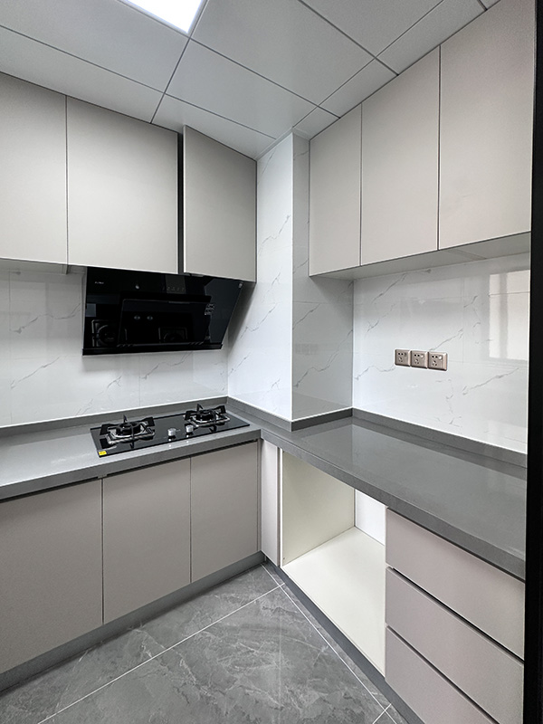 厨房推拉门让生活中的烟不易扩散其它空间。U型厨房,把上下左右收纳空间合理规划,具象地收纳,规整整洁度。前烹饪,配置时尚黑色集成灶+抽油烟机,清除烟火,化身烹饪大师;左洗菜区,分门别类清洗;右则是切菜区,根据不同菜系,展现不同的刀工,化身刀工大师。讲述烹饪的一道道佳肴故事。