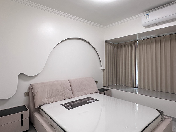 主卧以灰白色彩为主打色。石膏线背景墙,犹如一幅壮丽的画卷,描绘着连绵起伏的山峦,每一个细微的弧度,都仿佛在诉说着古老的故事,带给人无尽的遐想。床头位置精心配置了床头柜,为各种小物品提供了一个整洁有序的储存空间。从这里,让整洁成为一种习惯,转变生活态度。床尾别致的弧形造型书桌成为空间一大亮点。在这里,可以在闲暇时光品读办公,学识得以丰富,效率得以提升。