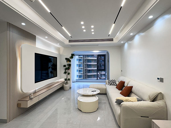 客厅以灰与白为主色调,缔造了空间的纯净与宁静,巧妙地运用了暖色调的灯光。灯光灰与白的底色相映成趣,为空间增添了一抹温馨与浪漫。光与影交织,在空间中自由舞动,演绎出优雅。L型沙发为空间量身定制,自然流畅的线条,舒适慵懒,在这里人们可以肆意地享受生活,感受时光的流转。
