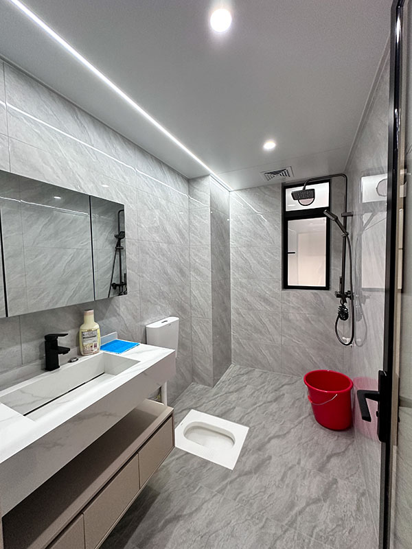 卫生间采用蹲厕设计,传统不变的生活习惯。灰色瓷砖布满整个空间,清洁so easy。洗漱台采用悬空隔层式设计,上面是洗漱区,下面是储物,实用性强。是净化身心的空间,在这里,人们可以卸下一天的疲劳,放松心情,重新焕发活力。