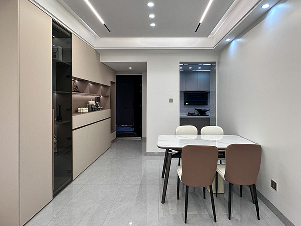 餐厅以明亮的灯光为起点,灯光点点滴滴洒落,感受到家的温暖。岩板餐桌延伸至空间,宛如一道风景线,将美食家人紧密地联系在一起。围坐餐桌前,在一言一语畅聊中,分享生活的点点滴滴,温馨极了。餐边柜与收纳柜一体化巧妙的设计,中间开放格方便展示各类装饰品,使空间更加生动有趣。玻璃展示柜用来收纳手办或装饰品,成为空间中的一道亮丽风景线。
