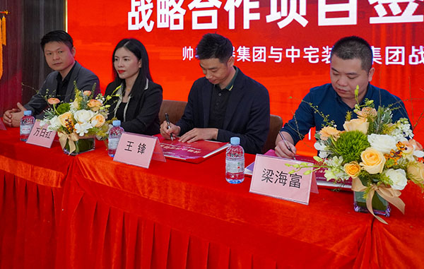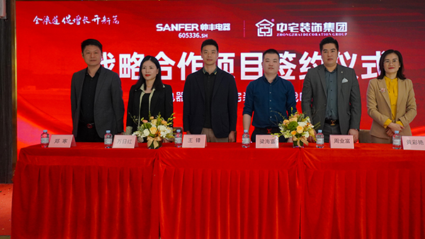 2023年12月13日,中宅装饰集团与帅丰电器品牌战略合作签约仪式在中宅集团总部举行。双方领导和代表们共同见证了这一重要的时刻,此次签约也标志着双方强强合璧,更好的服务消费者。