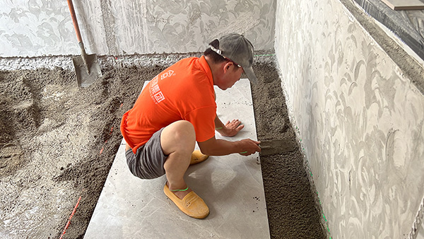 检查施工人员贴瓷砖地面的清洁度与水泥沙找平情况