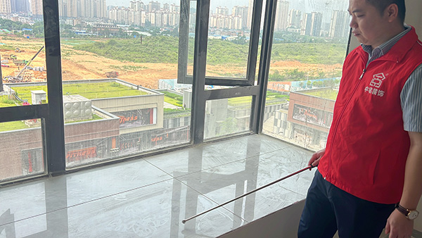 第三方监理公司区域经理使用阴阳角尺来检测墙面的垂直度