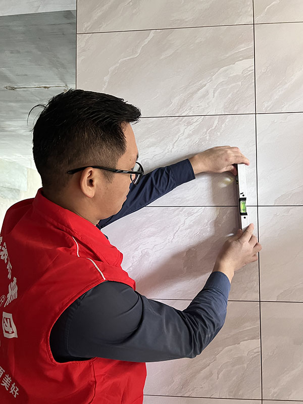 在贴砖阶段中宅装饰巡检团队严格按照规范上的施工要求,对施工进行严格管理,他们使用专业道具全方位检测瓷砖的平整度和空鼓率,不放过任何一处细节。对于瓷砖的留缝标准,普通瓷砖为1.5mm-2.0mm,巡检的工地瓷砖铺贴,密实、平整、留缝均匀符合施工标准,瓷砖碰尖整齐,检查均合格。