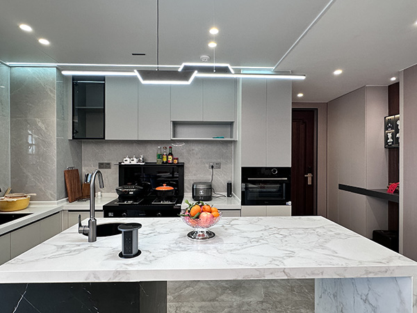 厨房L型布局,在有限的空间内,把洗、切、炒、烹所需使用的各个功能区互相配合,橱柜嵌入冰箱烘烤机,把多功能厨房的设计呈现得更为巧妙。