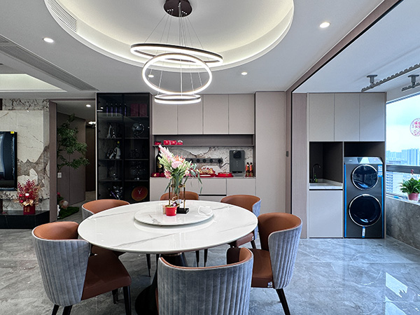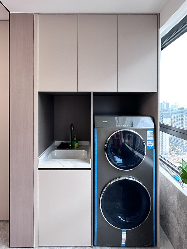 餐厅阳台一侧定制洗衣柜,大小刚好,上方是收纳区,下方是洗衣区,洗涤更方便,空间利用也更规整。