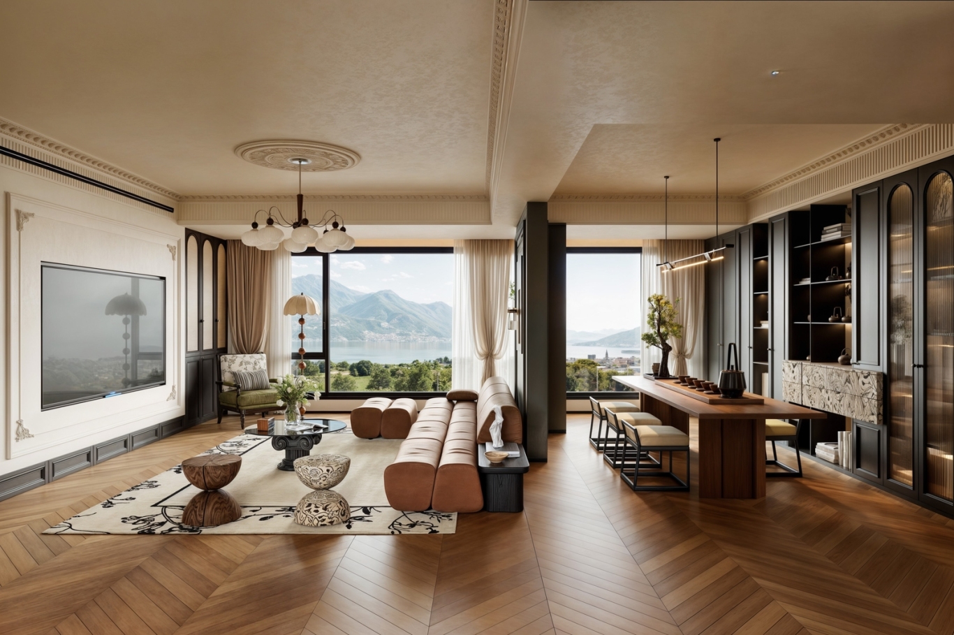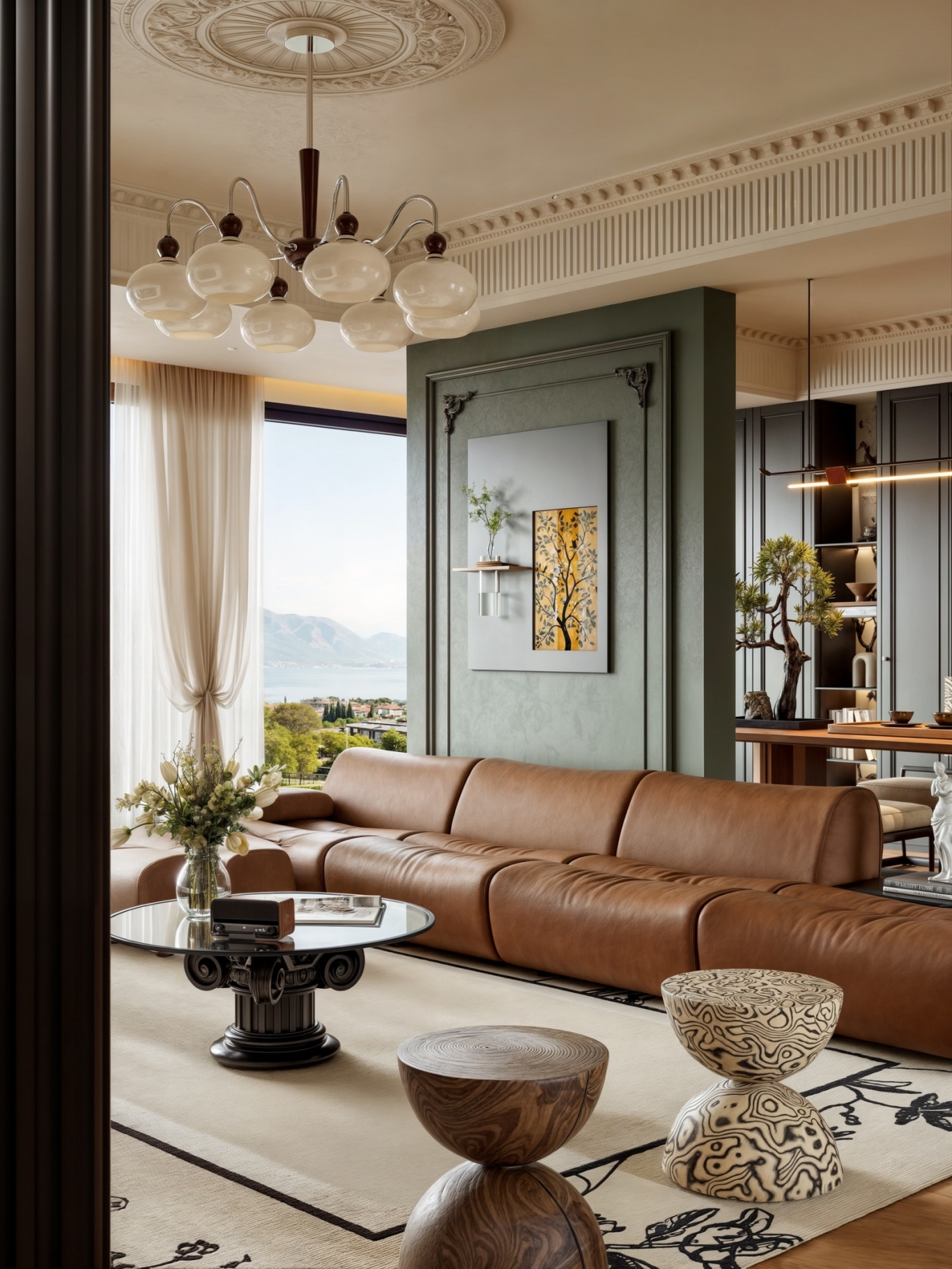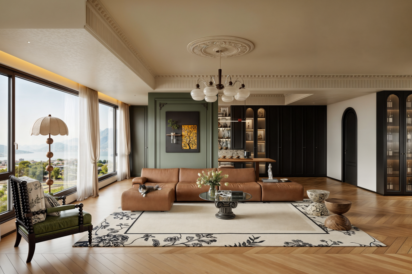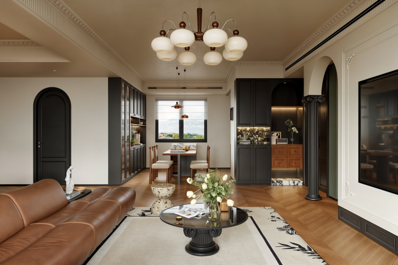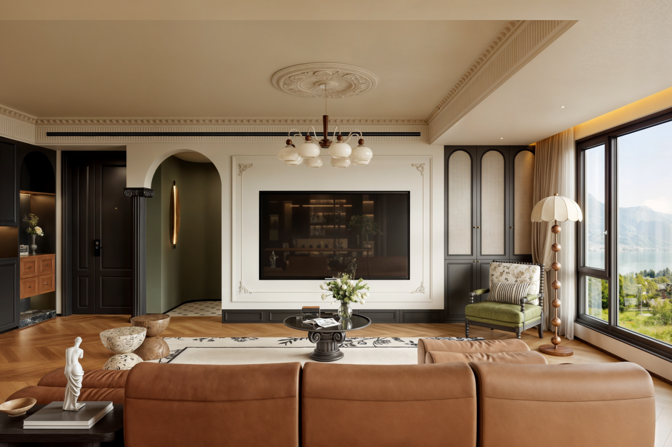 大面落地窗是灵魂,将风光引入室内,让自然成为最好的背景。搭配焦糖色模块沙发、复古花纹地毯,围合出慵懒的社交场景;顶面雕花石膏灯盘+法式石膏线,弱化层高不足的同时,强化优雅氛围;墙面留白+局部墨绿护墙,既简洁又有视觉焦点。