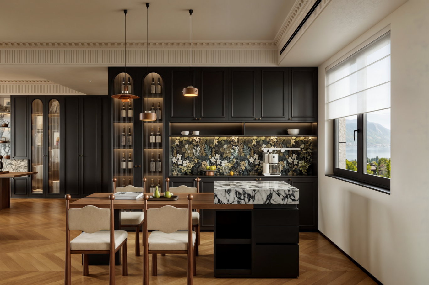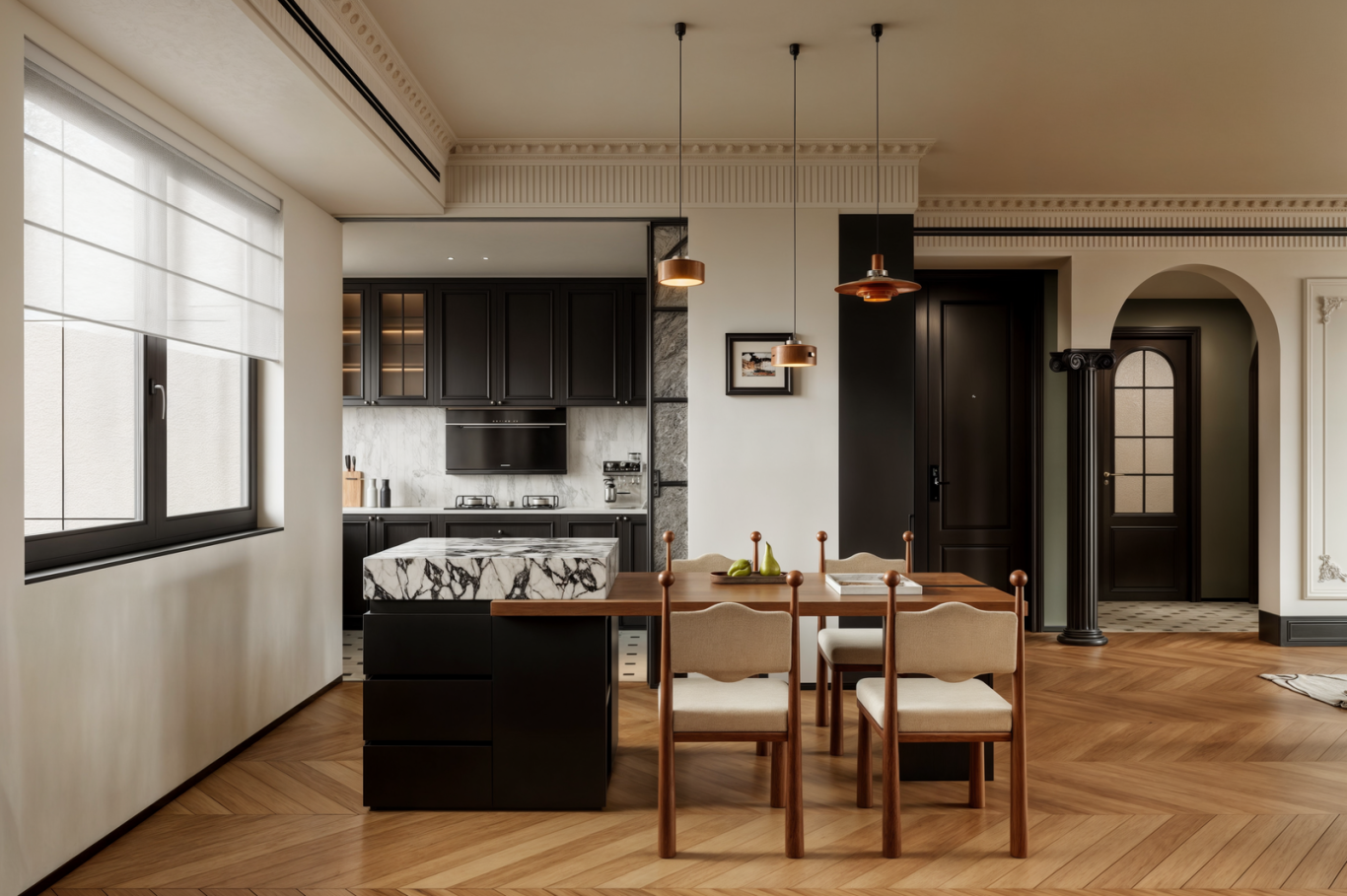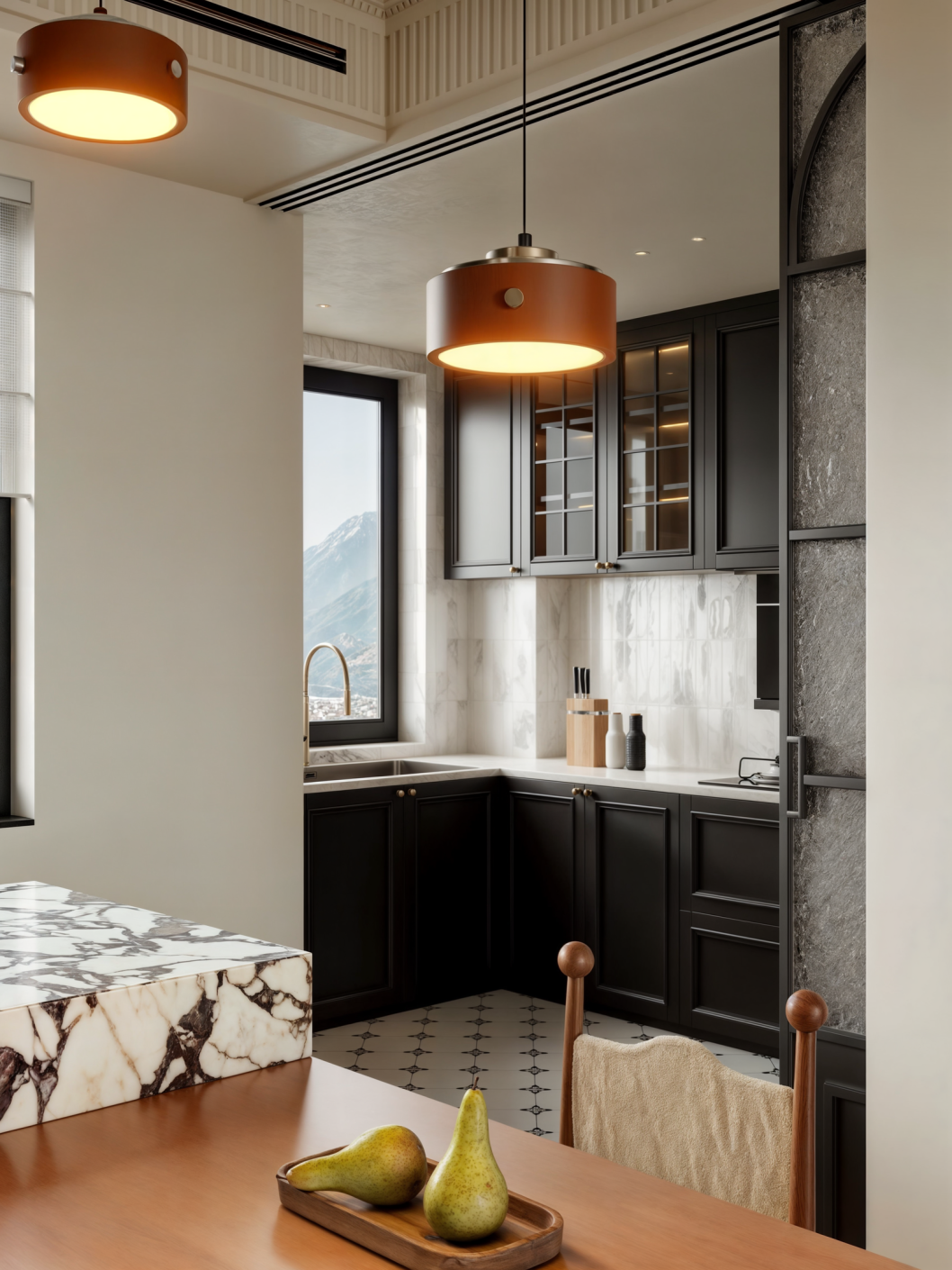 中岛与餐桌一体设计,既拓展操作台面,又成为家人互动的核心区。深黑柜体搭配玻璃柜门,既能展示餐具又方便收纳;铜色吊灯暖光笼罩用餐区,营造温馨的就餐氛围;厨房墙面用大理石瓷砖,耐脏易清洁,与整体风格呼应。
