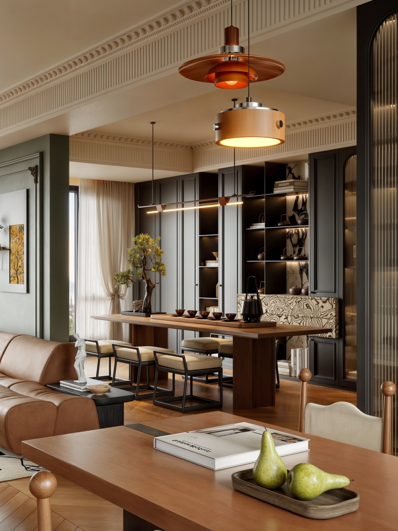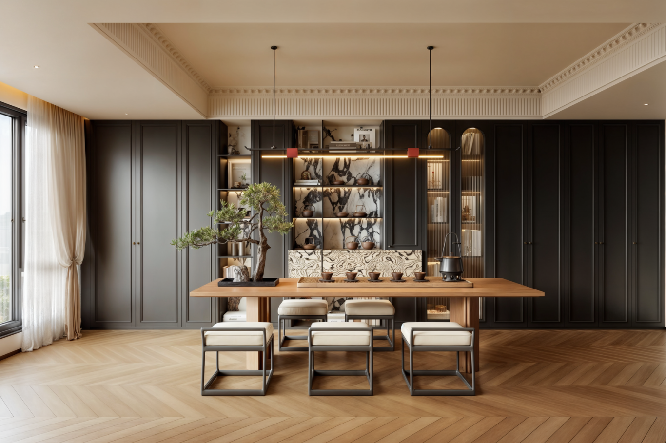 整面深灰护墙+开放式展示柜,既满足书籍、茶具的收纳需求,又成为空间的艺术展示面;木色长茶桌+简约金属脚凳,弱化传统茶桌的厚重感,适配现代生活节奏,是独处品茶、待客小聚的理想角落。