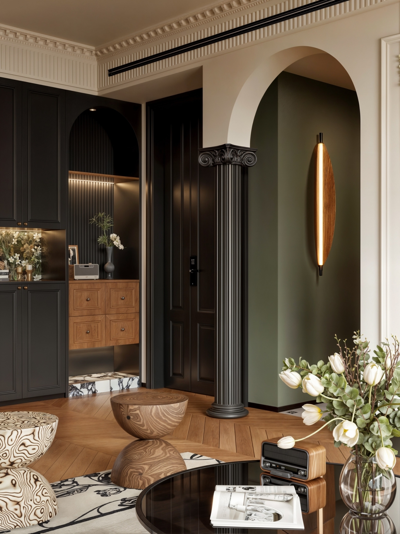 法式线条:顶面石膏线、墙面护墙板、拱形门洞,柔化硬朗柜体的棱角,让空间更柔和优雅;