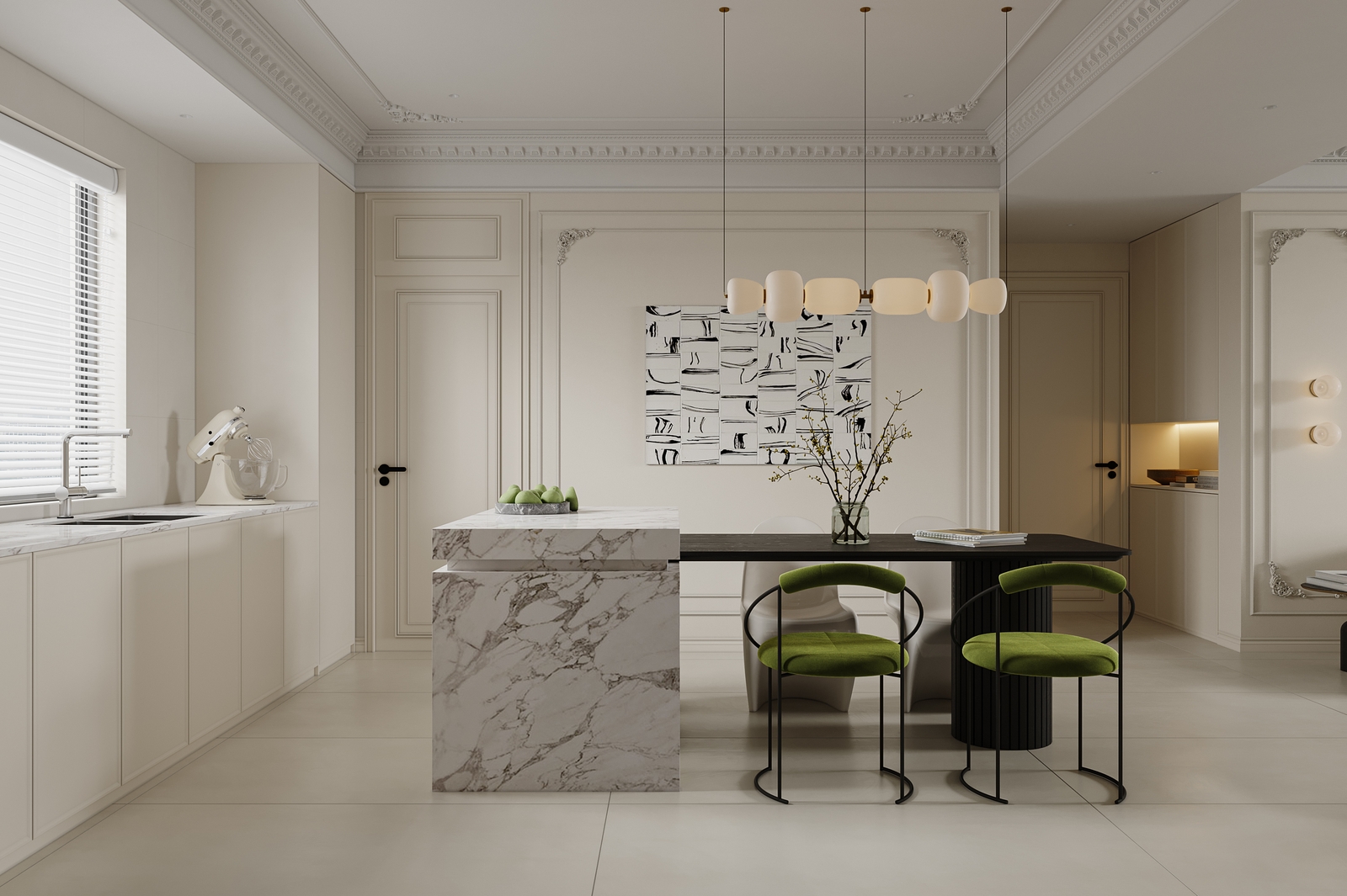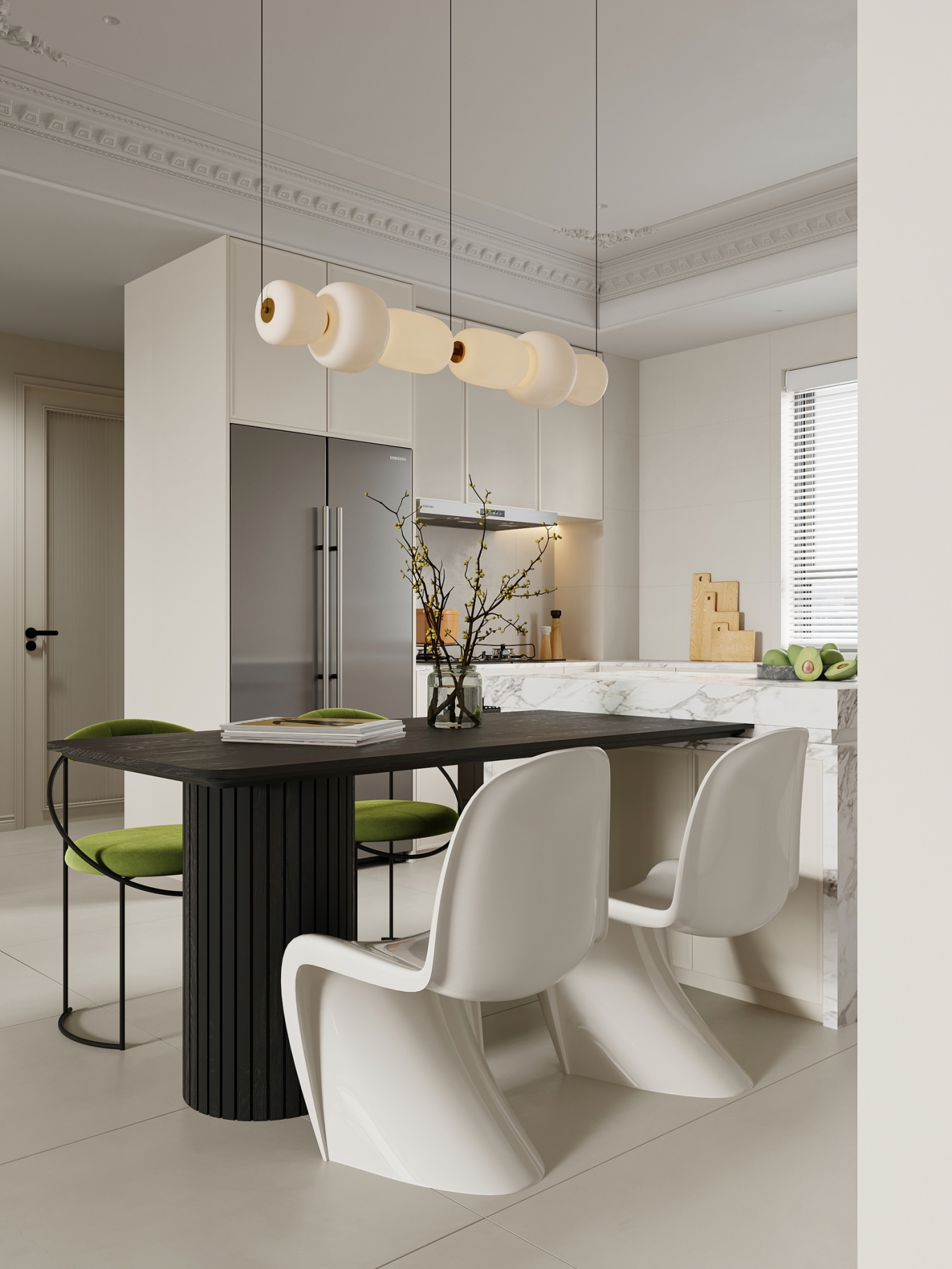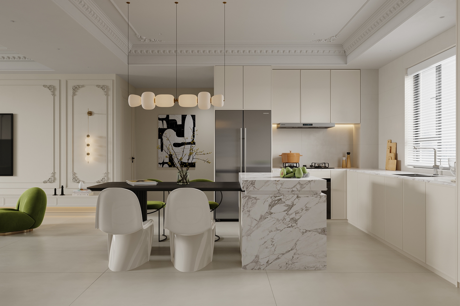 客餐厅:业主最满意的就是客餐厅打通设计,LDK一体化布局,视野瞬间开阔,平时和家人互动也更方便。餐厅摆放了黑色竖纹餐桌,搭配白色异形椅和两把绿色绒布椅,撞色感十足,再配上同系列的多头吊灯,简约又有设计感;中岛台选用大理石纹理,提升了轻奢感,平时可以在这里备餐、喝咖啡,实用性拉满。
