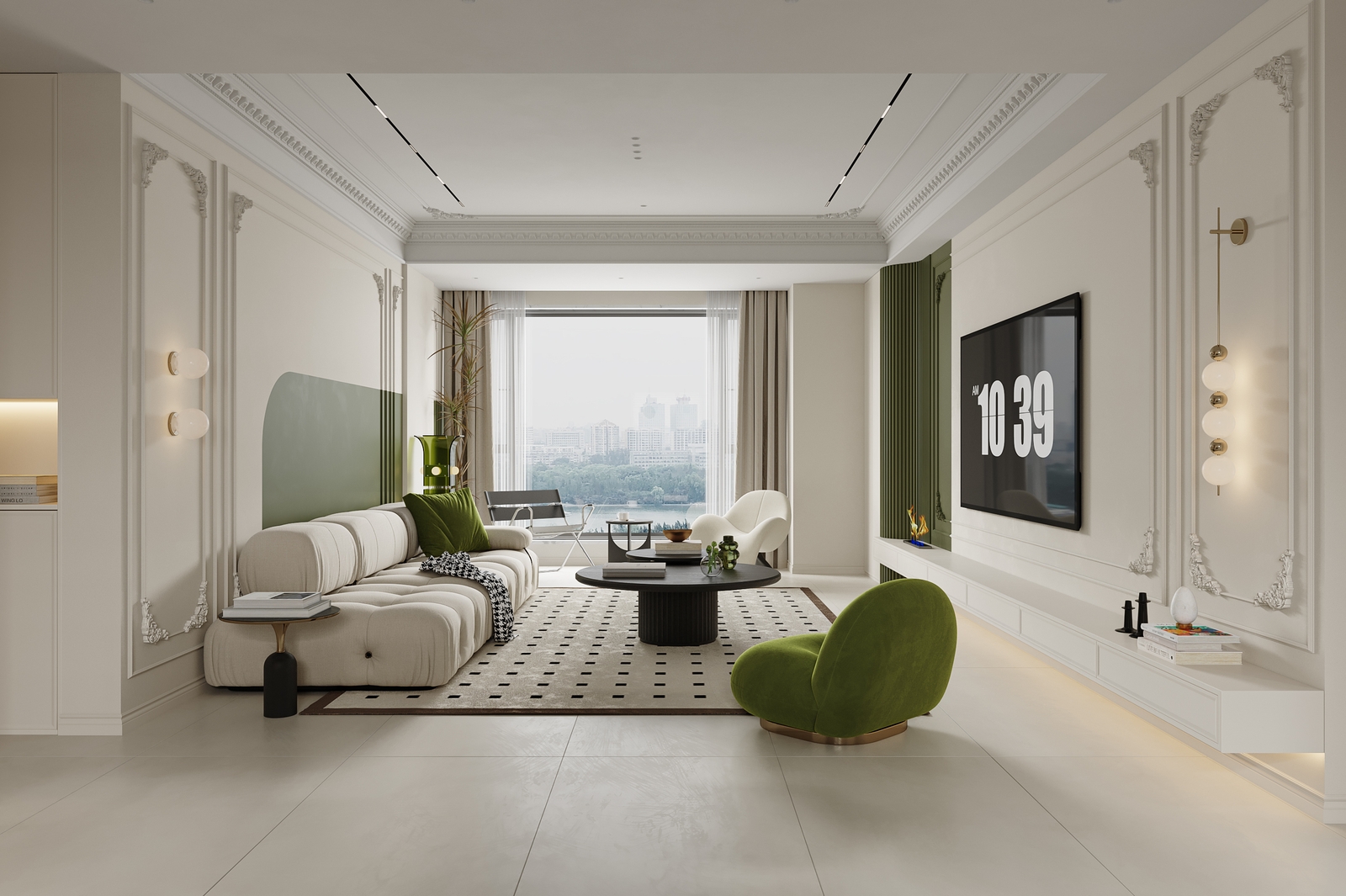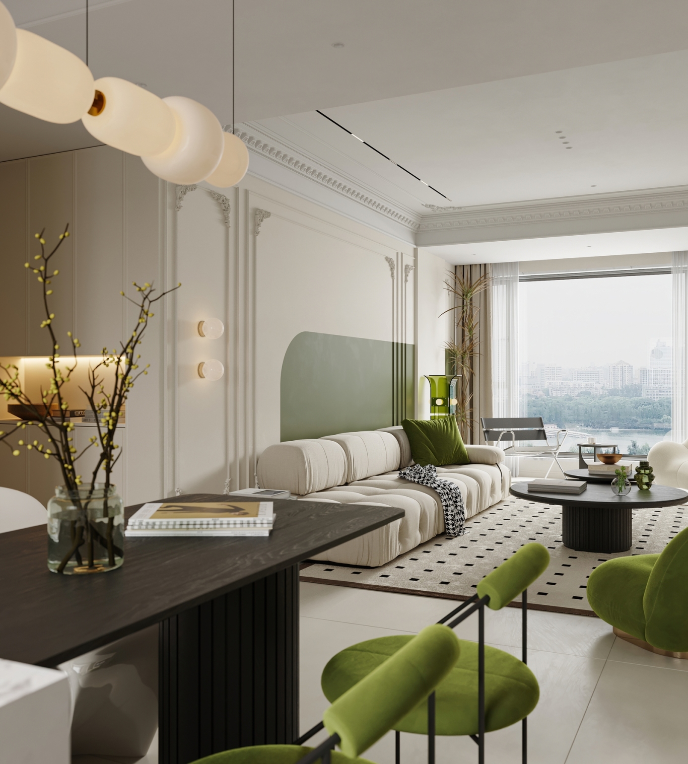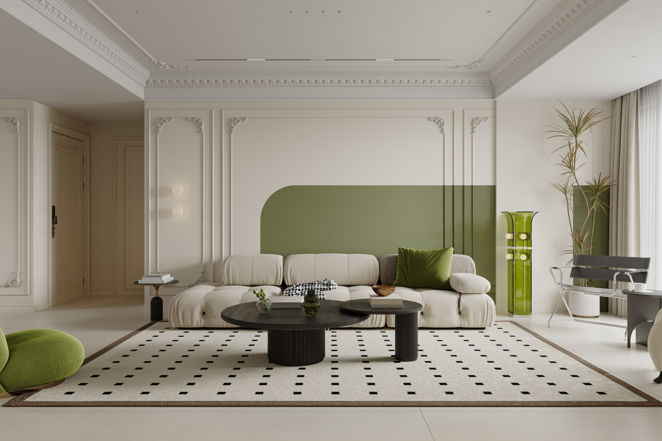 客厅摆放了米白色模块沙发,柔软又舒适,搭配黑色圆形组合茶几,简约大气,几何纹地毯划分出客厅区域,不凌乱还显层次感。电视墙保留了轻法式石膏线,搭配局部绿墙,再配上悬浮电视柜,简洁又显高级,还能增加收纳空间,避免杂乱。