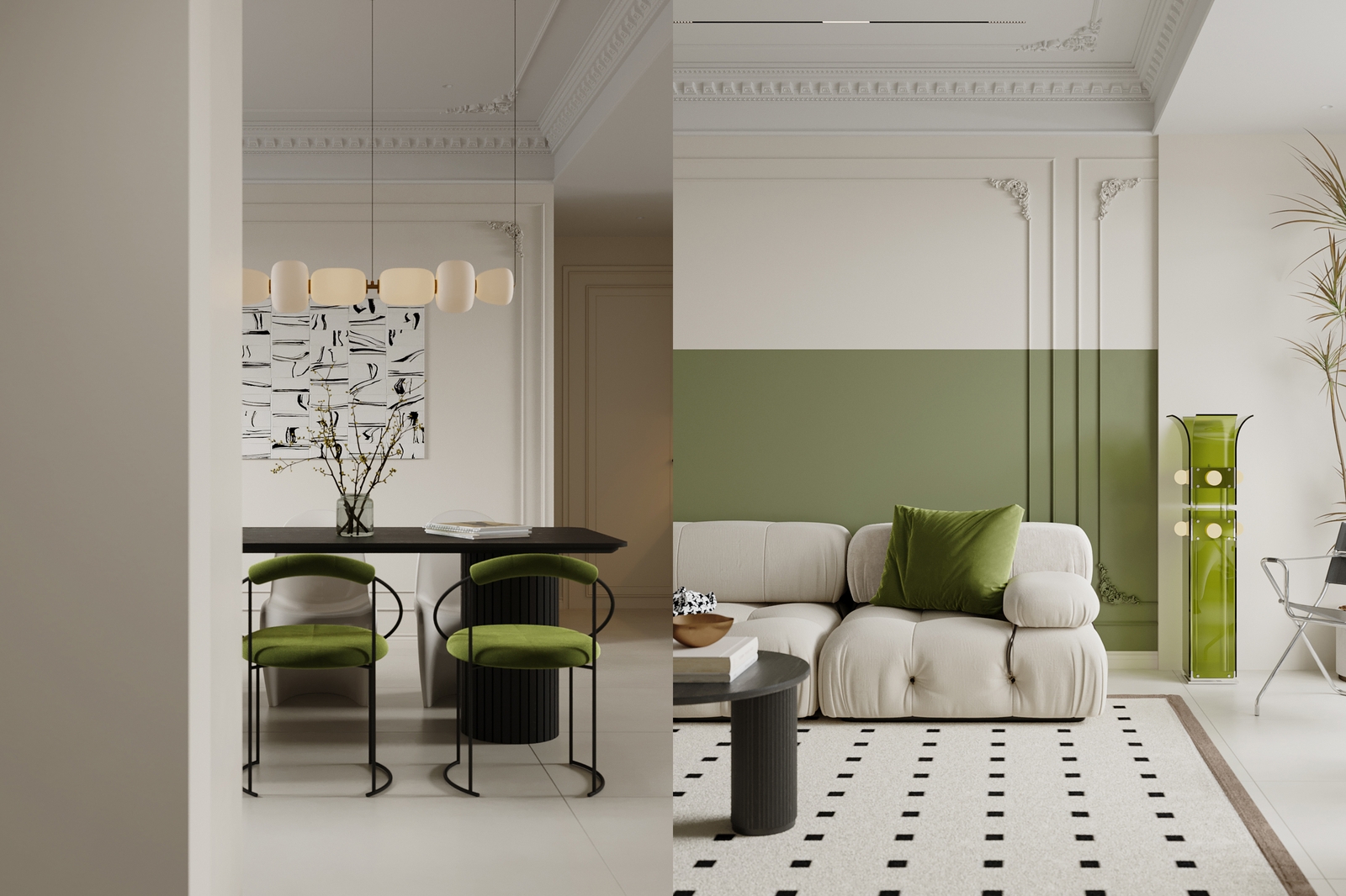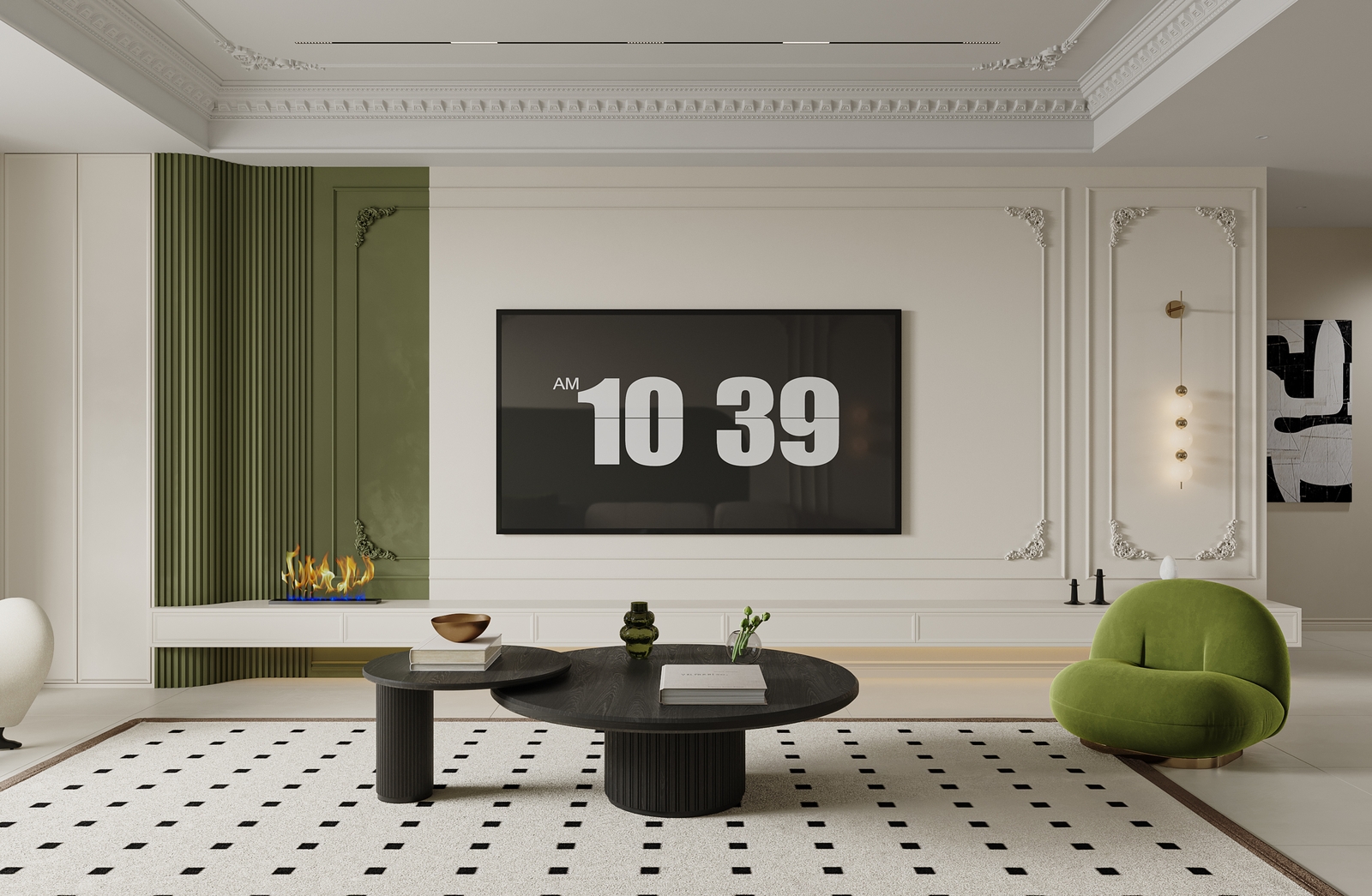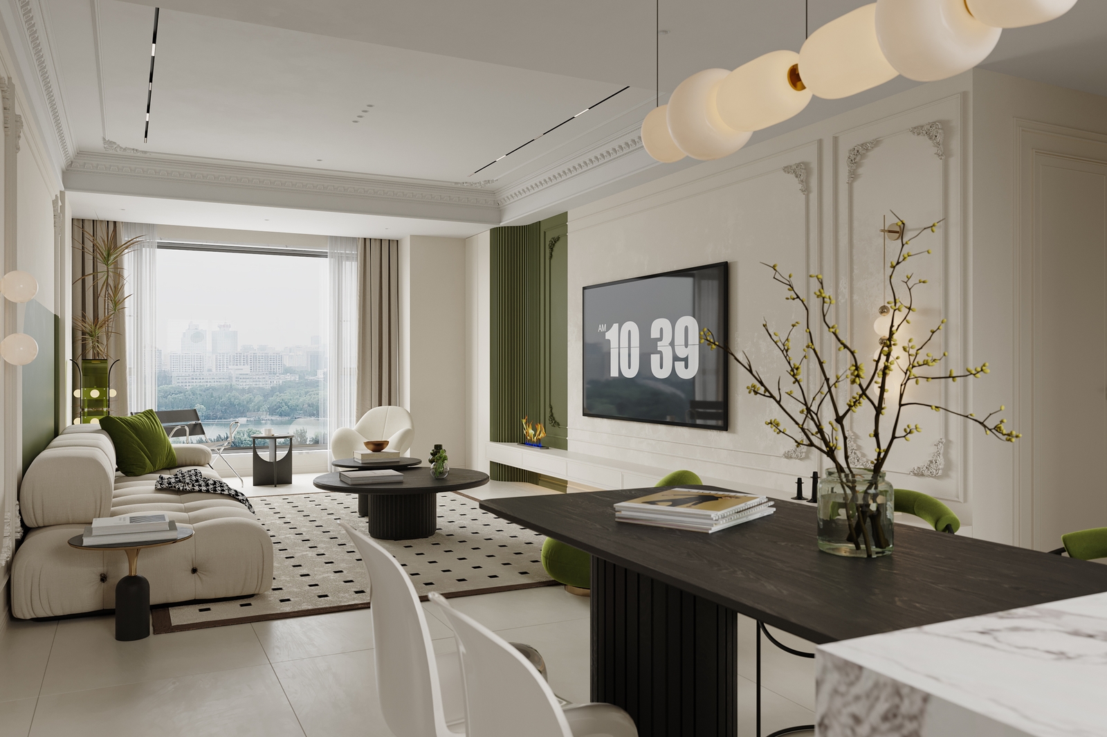 客厅摆放了米白色模块沙发,柔软又舒适,搭配黑色圆形组合茶几,简约大气,几何纹地毯划分出客厅区域,不凌乱还显层次感。电视墙保留了轻法式石膏线,搭配局部绿墙,再配上悬浮电视柜,简洁又显高级,还能增加收纳空间,避免杂乱。
